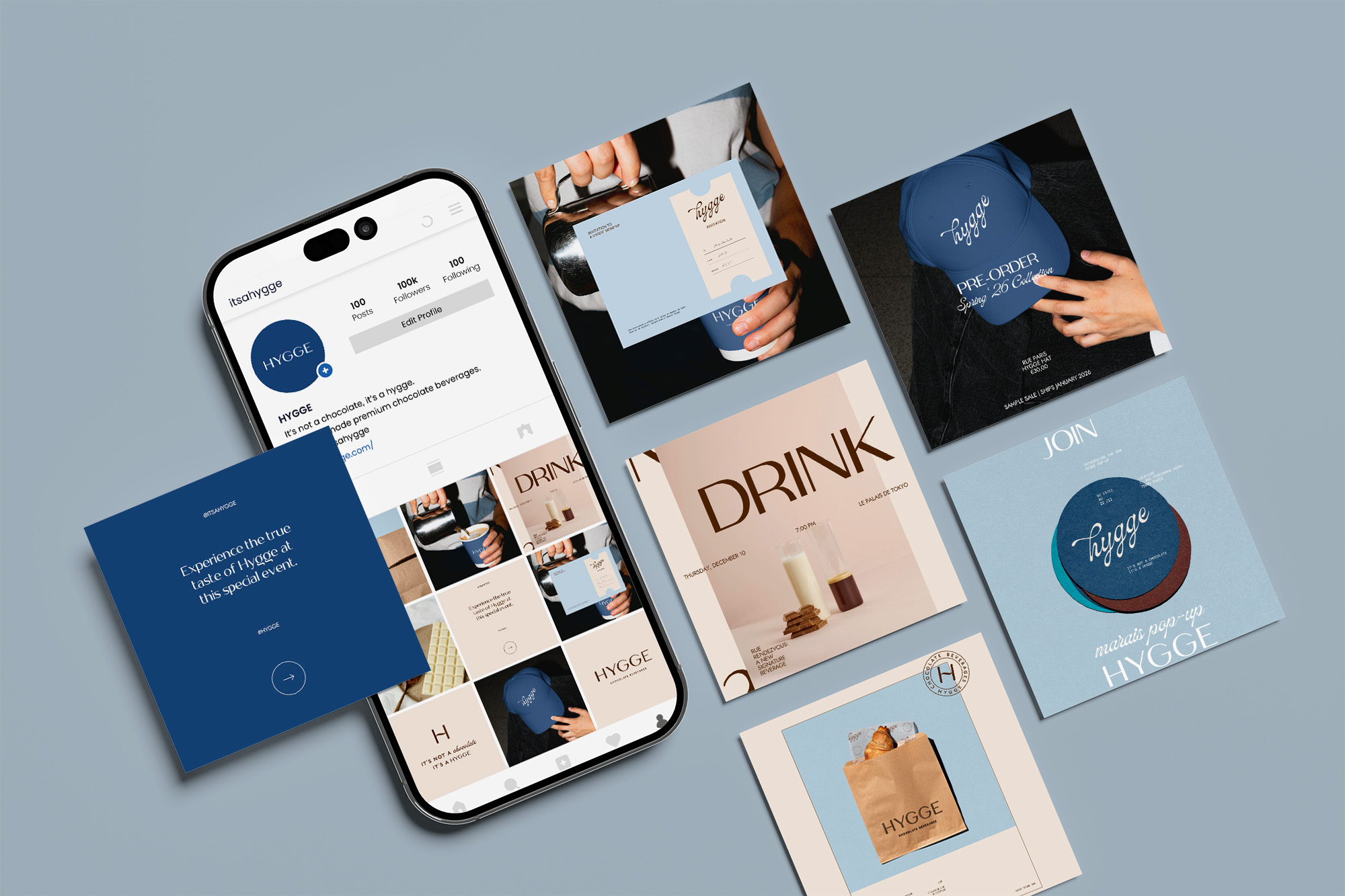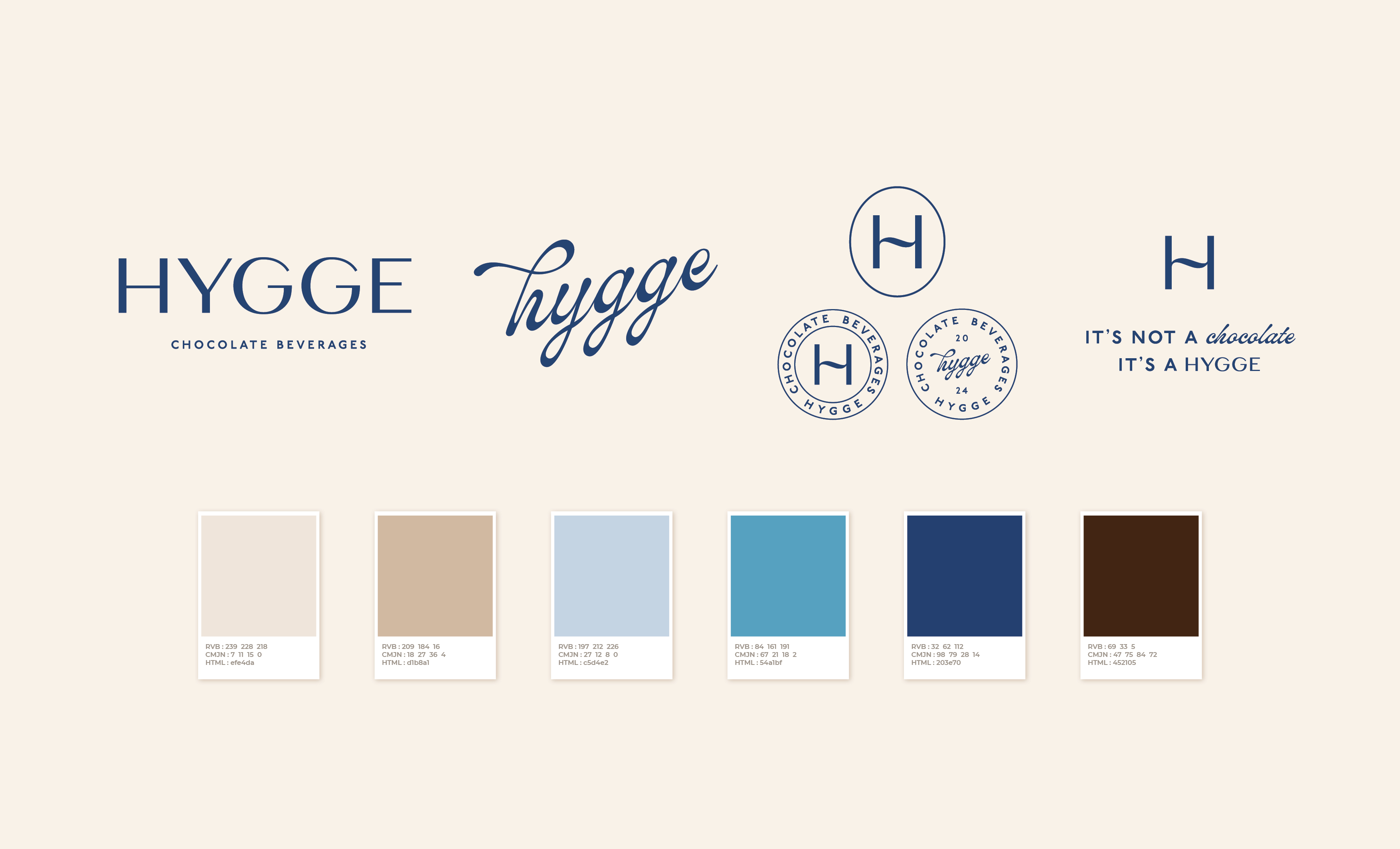Hygge est un coffee shop parisien inspiré de l’art de vivre danois, où le confort, la chaleur et la gourmandise se rencontrent. Fondé par Xavier, Yue et Alice, Hygge se distingue par ses boissons chocolatées premium, imaginées comme de véritables instants de douceur. Pour l’identité visuelle, j’ai créé un univers sobre et élégant, porté par un bleu signature immédiatement identifiable. Une esthétique qui allie finesse et modernité, pensée pour traduire l’expérience Hygge : un moment à part, simple, apaisant et réconfortant.
