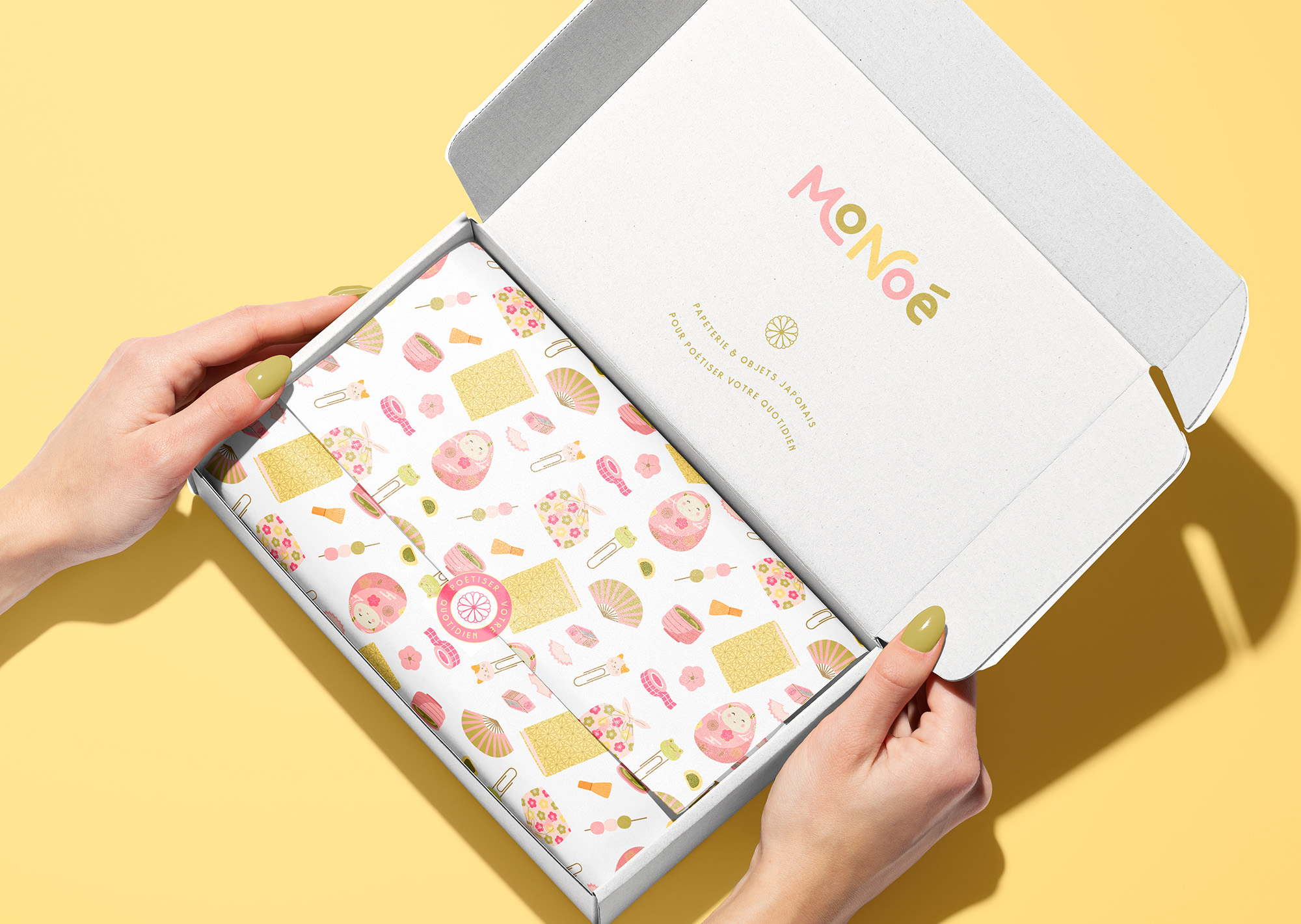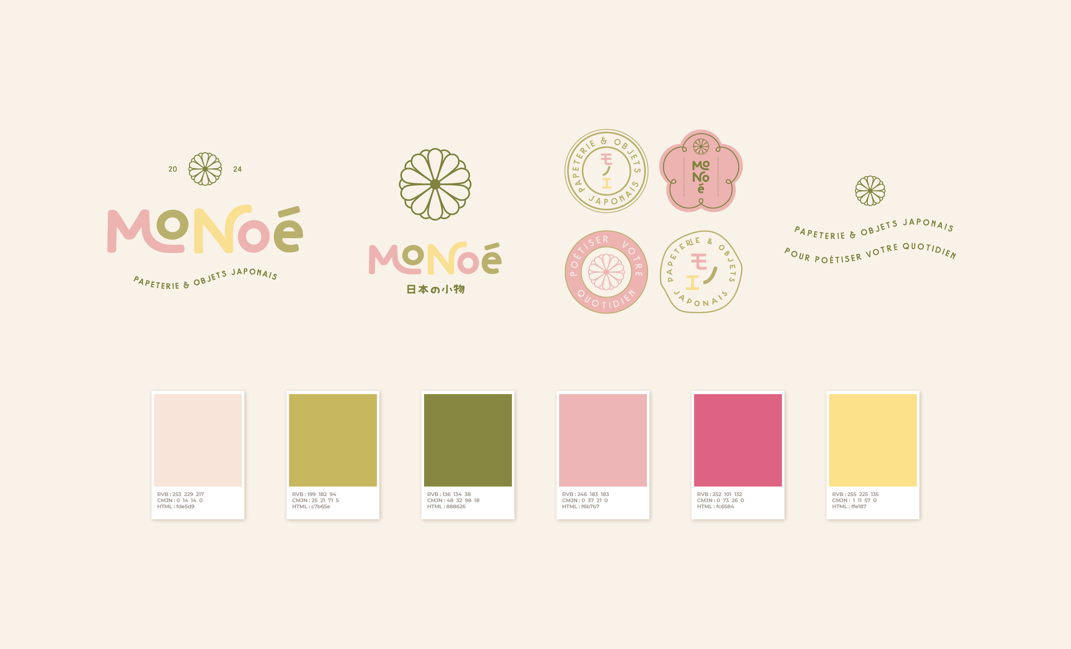 Monoé est une marque de papeterie et d’objets japonais créée par Noémie et Shu. Le projet s’ancre dans leur histoire personnelle et dans l’affection profonde de Noémie pour la culture japonaise, façonnée au fil de ses trois années passées à Tokyo. Pour donner vie à Monoé, j’ai conçu une identité visuelle fun et colorée, pensée pour traduire l’esprit joyeux, tendre et japonisant qui définit la marque. Les illustrations, les motifs inspirés de l’esthétique japonaise et la palette lumineuse s’unissent pour créer un univers doux, vivant et expressif, en continuité avec ce que Noémie partage depuis longtemps avec sa communauté. Le nom “Monoé” associe le mot japonais mono (« chose ») au début du prénom de Noémie, symbolisant ces petites choses qu’elle a découvertes, aimées, et qu’elle souhaite désormais transmettre.